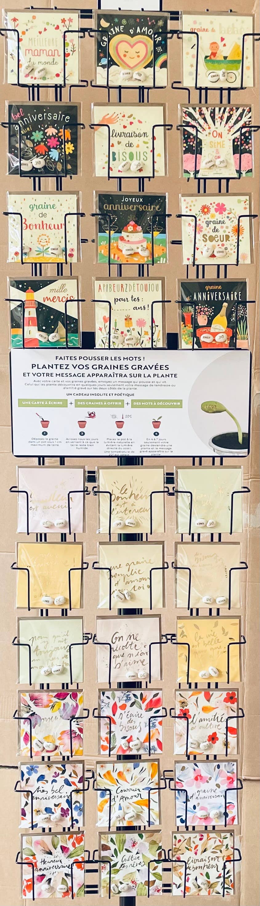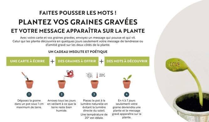 Carte à dorure 10,5×10,5 cm avec enveloppe sous cellophane et 2 graines gravées “Love” et “Bonheur”. Apres avoir planté les graines, le message de vos graines gravées apparaîtra sur la plante en 5 à 8 jours seulement. Explicatif de plantation fourni. Imprimée en France avec des encres végétales sur des papiers issus de forêts gérées durablement.